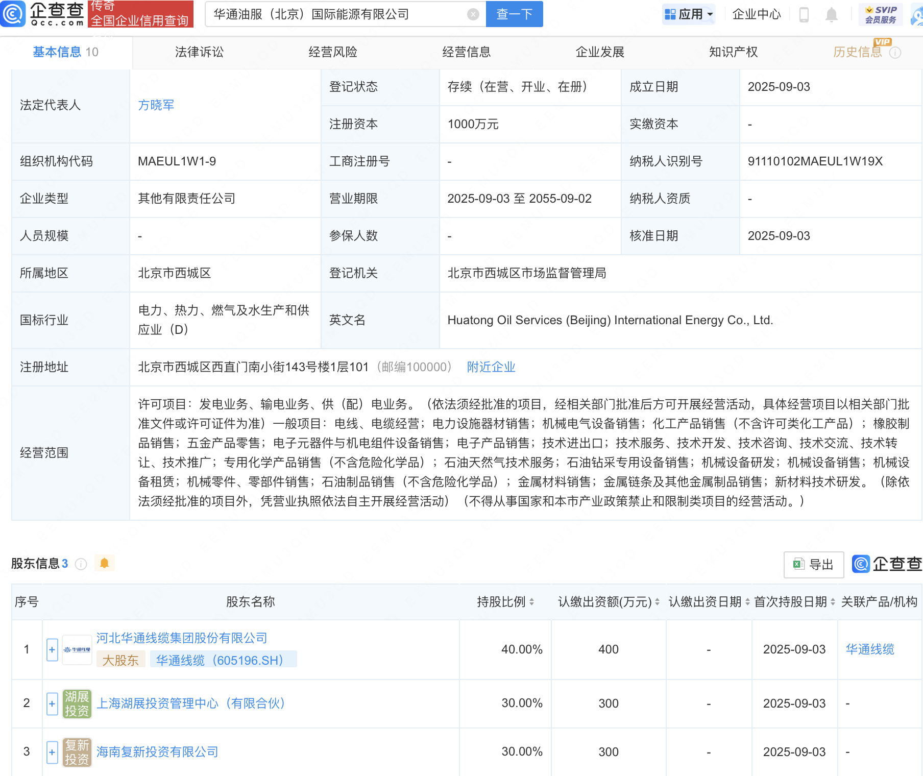 近日配资杠杆炒股,华通油服(北京)国际能源有限公司成立,注册资本1000万元,经营范围包含:石油天然气技术服务;石油钻采专用设备销售;机械设备研发;机械设备销售等。企查查股权穿透显示,该公司由华通线缆(605196)等共同持股。