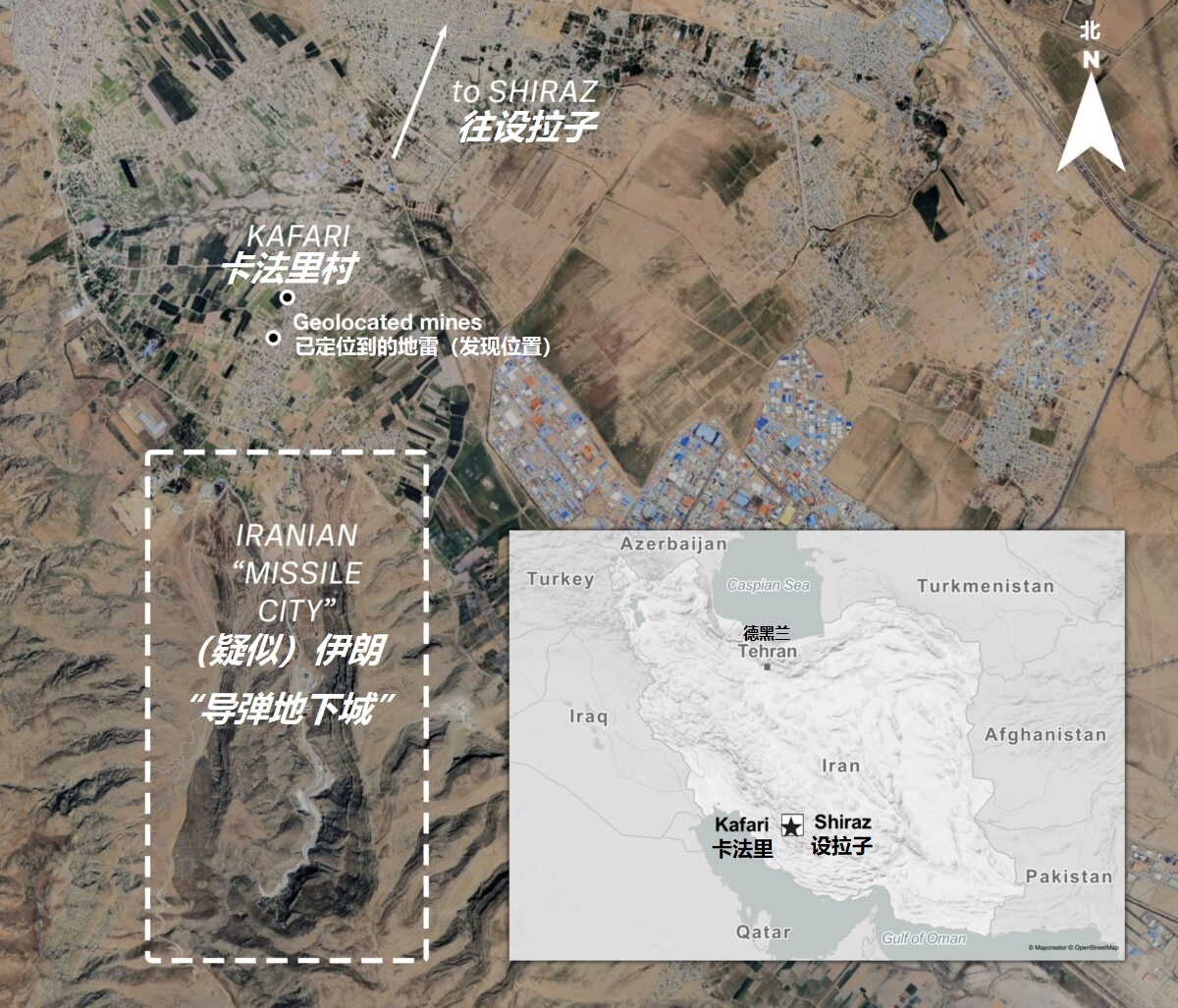 报道引用了一些互联网上开源情报组织的分析,表示部分地雷的位置处于卡法里村,其中“至少有三枚”地雷的位置投放在了“据称位于设拉子南部的伊朗导弹基地入口两公里处”。根据这些组织的分析,在目前卷入冲突的各国当中,美国是唯一已知拥有该型地雷的国家,尽管在1979年伊斯兰革命前的巴列维政权曾从美国购买了大批武器,但该型地雷是在美国不再向伊朗提供武器的1980年代所开发的,因此不太可能是伊朗利用其库存美制武器进行的“假旗行动”;另一方面,根据斯德哥尔摩国际和平研究所统计的武器转让数据库以及美国自身公开的重大军售信息,该型地雷也没有曾经出售或转移给以色列的明确证据。